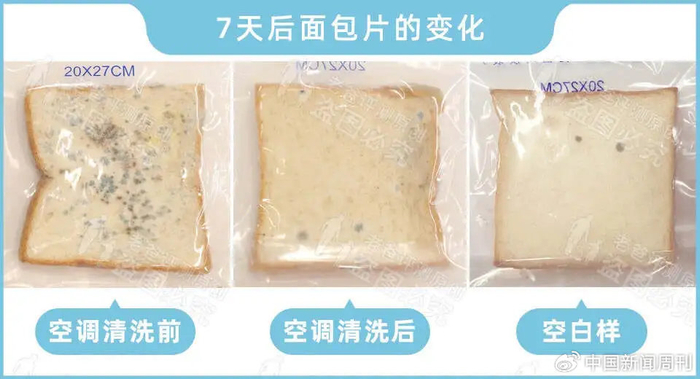 图源:小红书(已获授权)这些是看得到的脏东西,一些看不见的脏东西同样杀伤力不小。老爸测评曾对一台使用了十多年的空调进行清洗前后的对照实验。研究人员分别在空调清洗之前和之后将无防腐剂面包片放在出风口吹十分钟,另外再准备一份未做任何处理的面包片作为对照组,然后将这三片面包放入无菌密封袋放置七天。结果显示,被未清洗的空调吹过的面包片布满了菌落。