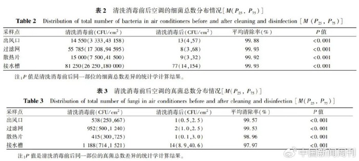 图源:老爸测评一篇发表于《现代预防医学》上的论文也对家用空调微生物污染现状及清洗消毒效果进行了研究。实验抽取了15台家用空调,采样本120份,分别对清洗消毒前后的家用空调出风口、过滤网、散热片和接水槽四个重要部位进行无菌采样。结果显示,家用空调清洗消毒前细菌和真菌污染都很严重。家用空调出风口、过滤网、散热片和接水槽的细菌总数平均值分别为2.51×10⁴CFU/cm²、6.79×10⁴CFU/cm²、3.16×10⁴CFU/cm²、1.40×10⁵CFU/cm²,真菌总数平均值分别为534CFU/cm²、948CFU/cm²、465CFU/cm²、2042CFU/cm²。由于目前国内外尚无家用空调卫生规范,参考《公共场所集中空调通风系统卫生规范》(WS394—2012)规定的集中空调风管内表面细菌总数和真菌总数均需要≤100CFU/cm²,可以看出研究中的家用空调四个部位的细菌总数和真菌总数超出标准值1.5~2810倍。
