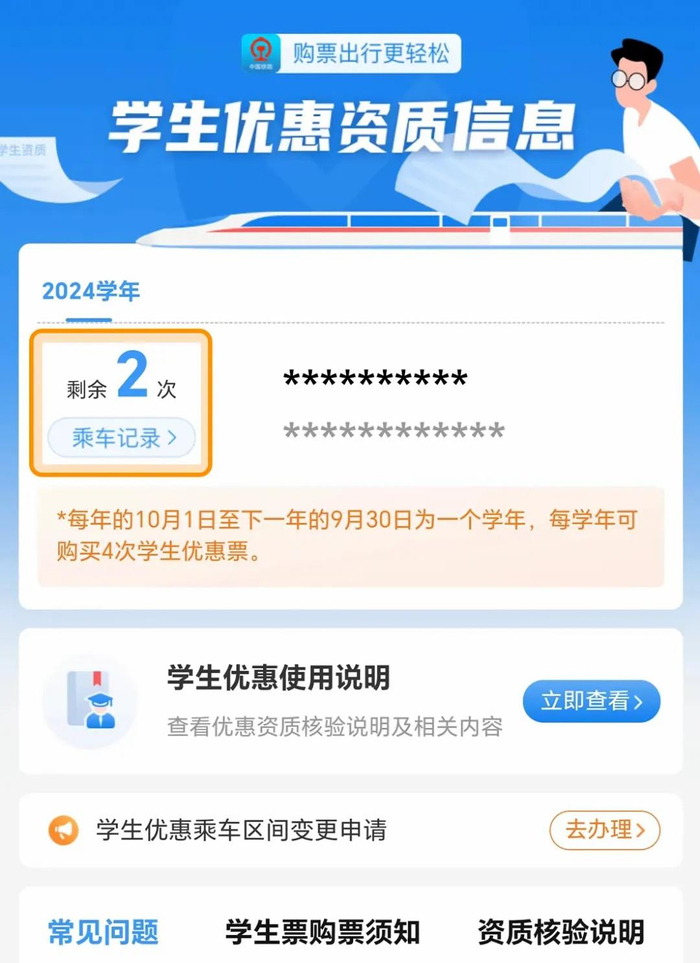 同时也需要对比学生证中的家庭住址和乘车区间,在线修改学生优惠资质乘车区间。已完成学生优惠资质核验的用户,每一学年可申请在线变更乘车区间4次。完成修改后,学生优惠资质信息将立即生效,即可根据当前年度剩余优惠次数在线购买学生票。