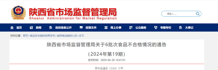 陕西省市场监督管理局关于6批次食品不合格情况的通告(2024年第19期)