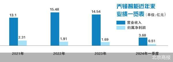 值得一提的是,2022年、2023年,乔锋智能净利已连续两年走低,2021—2023年,公司实现营业收入分别约为13.1亿元、15.48亿元、14.54亿元,对应实现归属净利润分别约为2.31亿元、1.91亿元、1.69亿元。