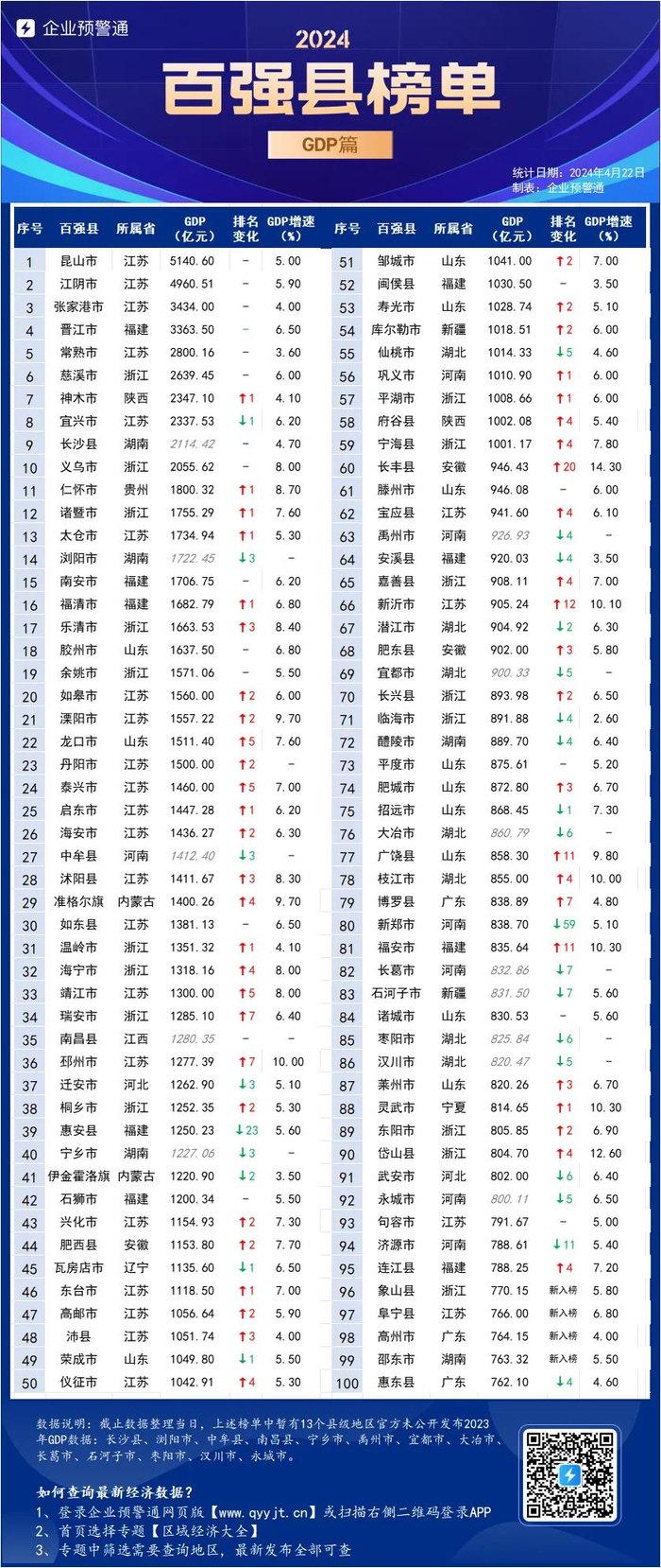 企业预警通【百强县】系列盘点,整理如下。