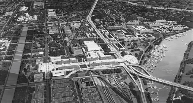 Webb & Knapp,华盛顿西南区都市重建项目(1953–1959)早期方案效果图,华盛顿特区,约1957年。由Robert Schwartz绘制。©Pei Cobb Freed & Partners