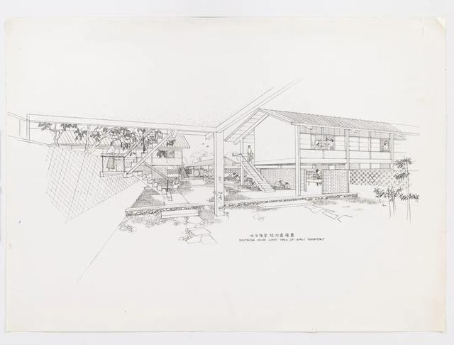 陈其宽(绘图师),贝聿铭建筑师,东海大学(1954–1963)女生宿舍庭院内透视景观,台中,约1955年,复印本,图片:M+,香港,获授权数码复制 © Pei Cobb Freed & Partners