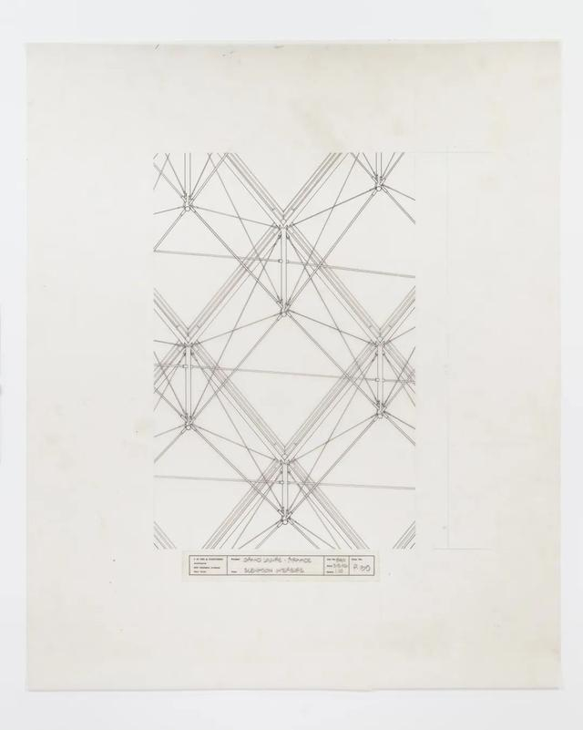 贝聿铭及合伙人事务所,大卢浮宫计划(1983–1993)的金字塔幕墙空间桁架内部立面图,巴黎,约1986年,墨水厚描图纸本,图片:M+,香港,获授权数码复制 © Pei Cobb Freed & Partners