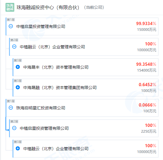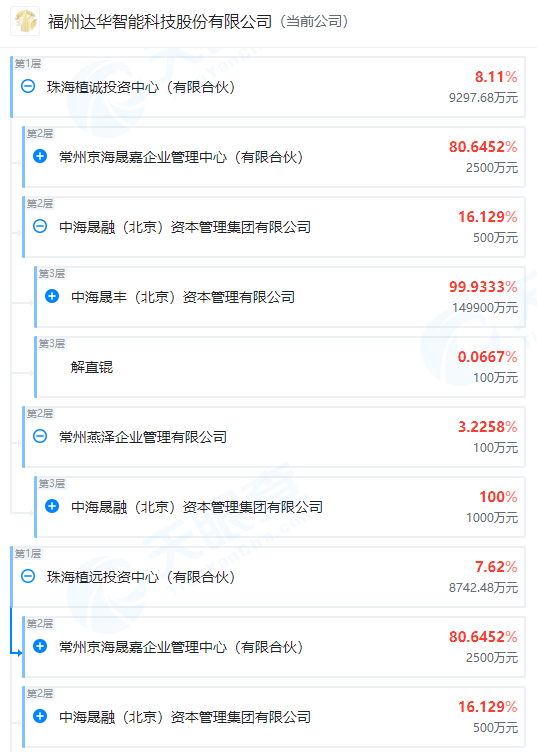 界面新闻查询天眼查获悉,穿透后,珠海植诚、珠海植远由中海晨丰(北京)资本管理有限公司、中海晟融(北京)资本管理集团有限公司、解直锟等间接持股。