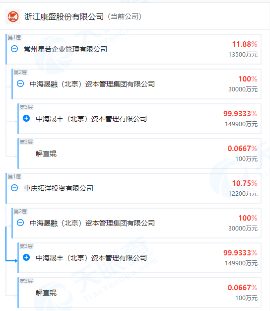截止公告日,康盛股份控股股东常州星若持有公司股份数量为135,000,000股,占公司股份总数的11.88%。控股股东一致行动人重庆拓洋持有公司股份数量为122,180,000股,占公司股份总数的10.75%。界面新闻查询天眼查获悉,穿透后,中海晨丰(北京)资本管理有限公司、中海晟融(北京)资本管理集团有限公司、解直锟间接控股常州星若及其一致行动人重庆拓洋。