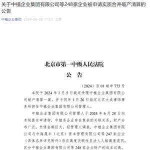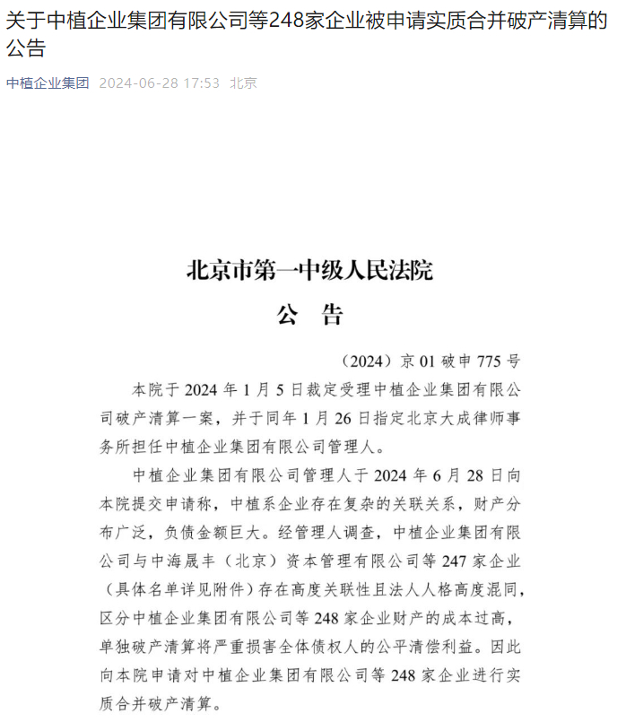 6月28日,中植企业集团有限公司(简称“中植集团”)官微发布《关于中植企业集团有限公司等248家企业被申请实质合并破产清算的公告》。