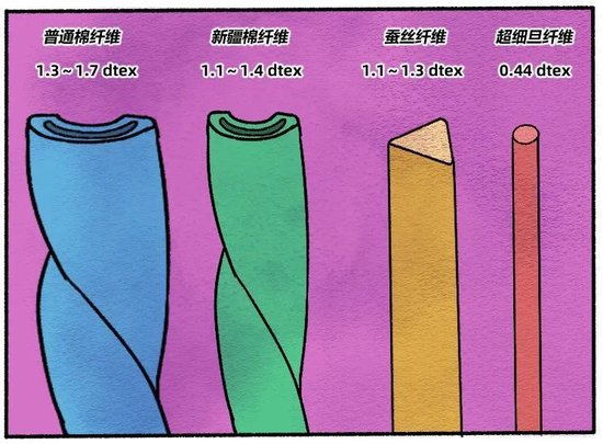 我们一起看看普通棉纤维、新疆棉纤维、蚕丝纤维、超细旦纤维,这四种常见纤维的粗细对比: