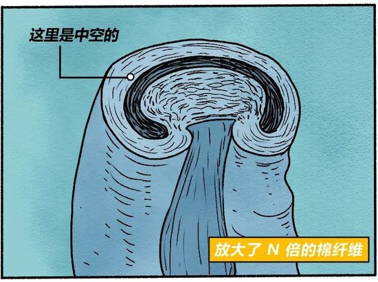 另外,棉纤维是一个中空结构,中间可以储水。放大来看,每一根棉纤维都像吸管一样,这也会强化棉纤维的吸水能力。