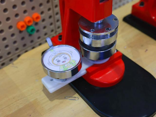 打开徽章制作机,依次放入金属盖、手绘专用纸和高清透明膜,用力挤压。随后放入塑料安全弹簧针,再次用力挤压,一个自制徽章就完成了。