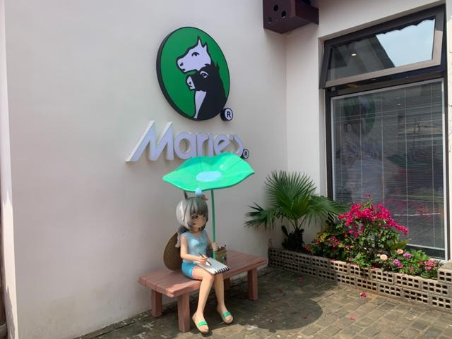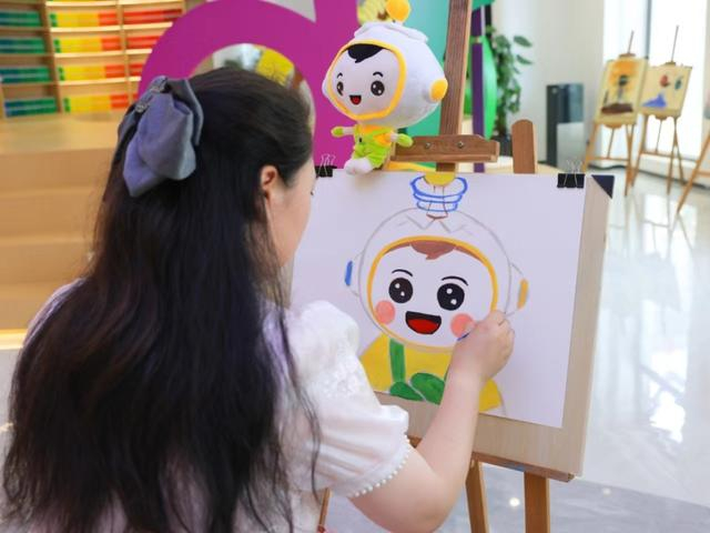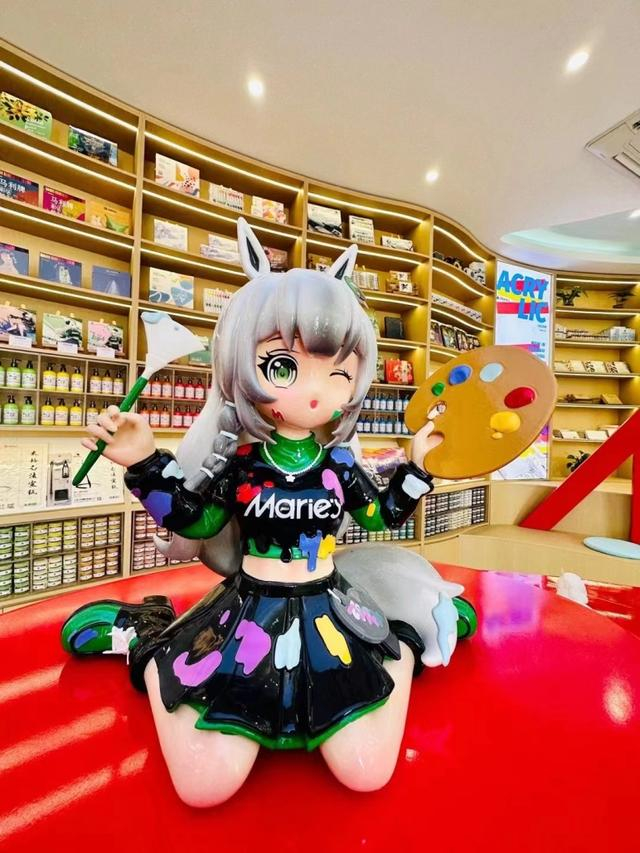 小鑫走进海智汇文创园,还没开始逛就被门口的“马小莉”吸引了目光。“马小莉”作为马利品牌虚拟形象代言人,撑着一把“荷叶伞”,坐在门口的长椅上等待前来体验的顾客……