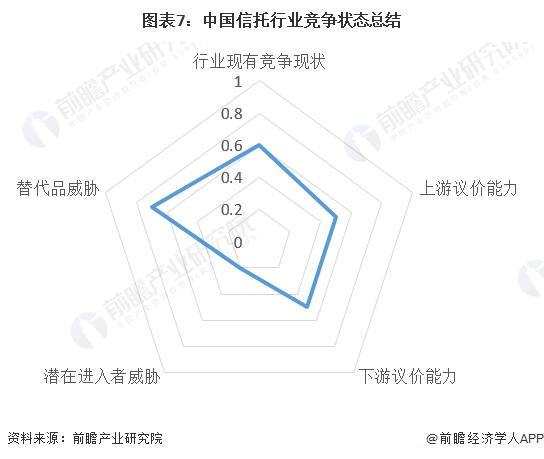 根据以上分析,对各方面的竞争情况进行量化,1代表最大,0代表最小,目前我国信托行业五力竞争总结如下: