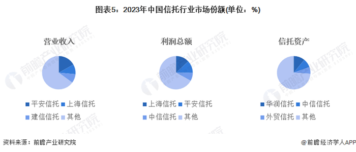 2023年,根据中国信托行业经营收入及各公司营业收入计算,平安信托、上海信托、建信信托位列前三,市场份额分别为17%、10%、9%;从利润总额的维度计算,上海信托、平安信托、中信信托位列前三,市场份额分别为13%、12%、8%;从信托资产的维度计算,华润信托、中信信托、外贸信托位列前三,市场份额分别为11%、9%、7%。