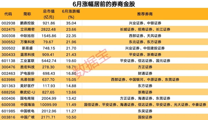 \r\n 兴业证券 和 中银证券 推荐的“苹果+AI PC+ AI手机 +PCB”概念股 鹏鼎控股 6月涨35.04%,居首。 立讯精密 6月涨幅超23%,居次席。