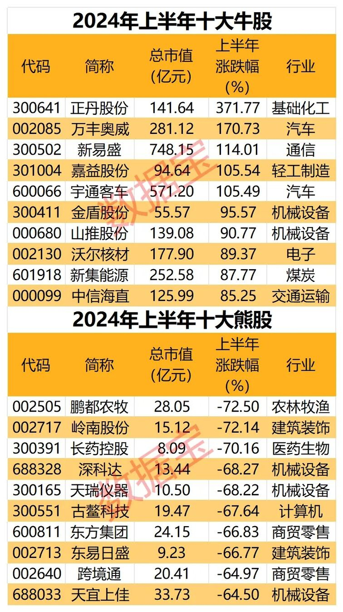 \r\n据数据宝统计,从个股来看,剔除年内上市的新股,上半年十大牛股涨幅均超85%。其中, 正丹股份 以371.77%的涨幅成为最大黑马, 万丰奥威 以170.73%的涨幅位居第二, 新易盛 、 嘉益股份 、 宇通客车 也均涨超100%。