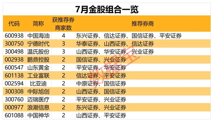 \r\n从个股来看, 中国海油 获4家券商推荐,居首; 宁德时代 和 温氏股份 均获3家推荐,居次席。