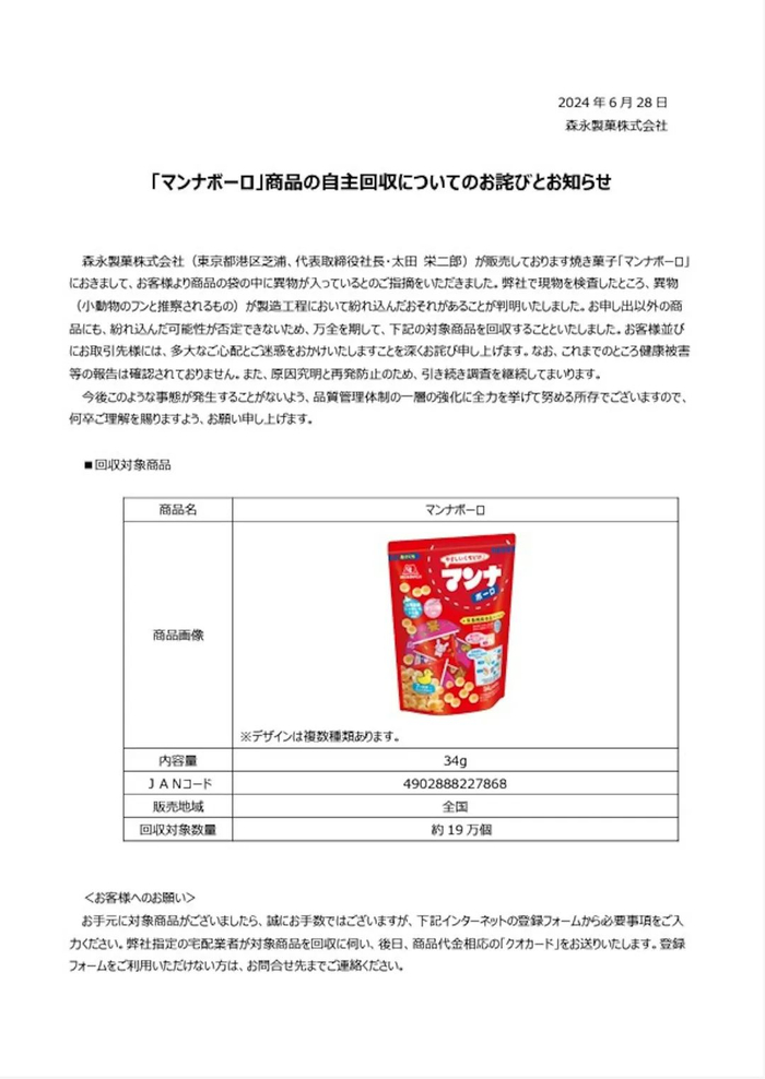 据媒体报道,日本知名零食“森永小馒头”被曝丑闻,6月28日起主动回收约19万件产品。