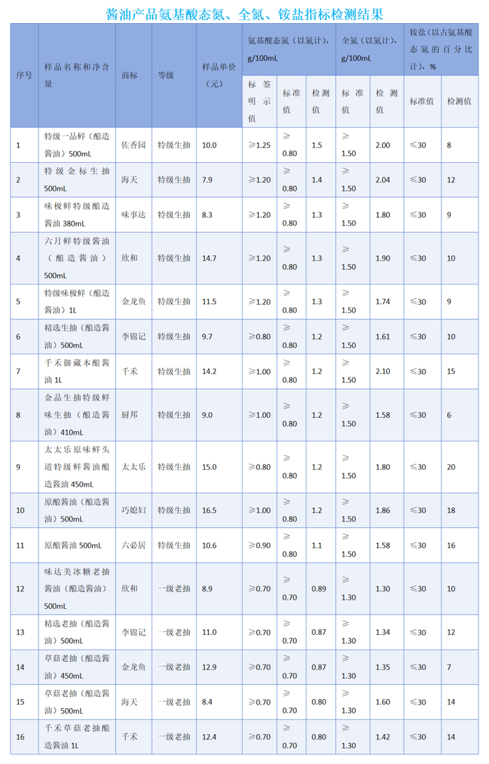 经检验,16批次酱油样品的氨基酸态氮、全氮(以氮计)、铵盐(以占氨基酸态氮的百分比计)、铅、总砷、黄曲霉毒素B1等指标均符合相关标准及产品标签明示的要求。