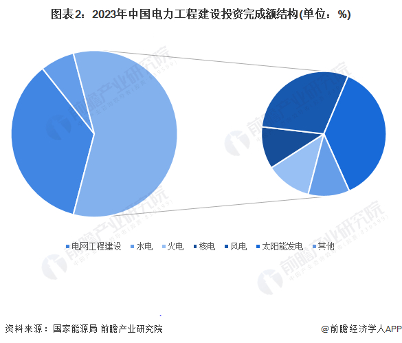 2023年,全国完成电力工程建设投资额共14950亿元,其中电网工程建设完成投资额5275亿元,占比35%;电源工程建设完成投资额9675亿元,占比65%。在电源工程建设中,太阳能发电完成投资额超过3200亿元,占全国电力工程建设投资额的比重突破20%,其余能源的投资占比均在20%以下。