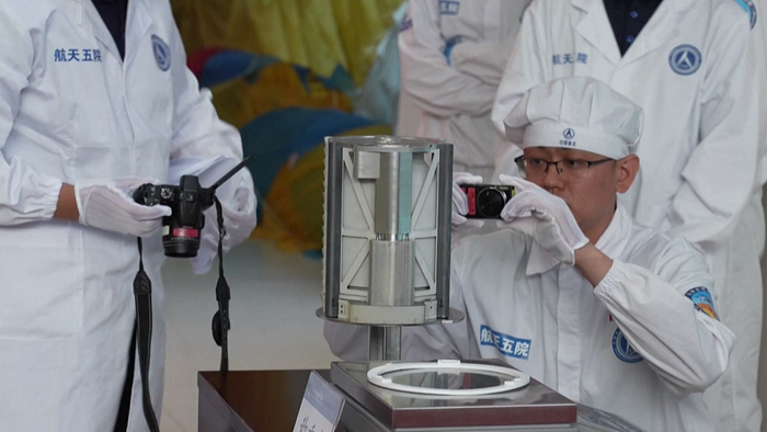 2024年6月26日,北京,嫦娥六号返回器开舱活动在中国航天科技集团五院举行。科研人员拍摄月球土壤样本。(视频截图)图源:视觉中国