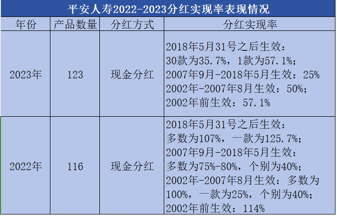 平安人寿近期也公布了分红实现率。其最新年度的分红实现率也出现了大幅下降,主要产品从去年的75%—114.3%下降到25%—57.1%(不包括外币产品:“平安赢越人生年金保险”)。据统计,123款产品2024/6/1 - 2025/5/31红利分配期间的年度平均分红实现率约为35.24%,其中多数产品分红实现率为35.7%。