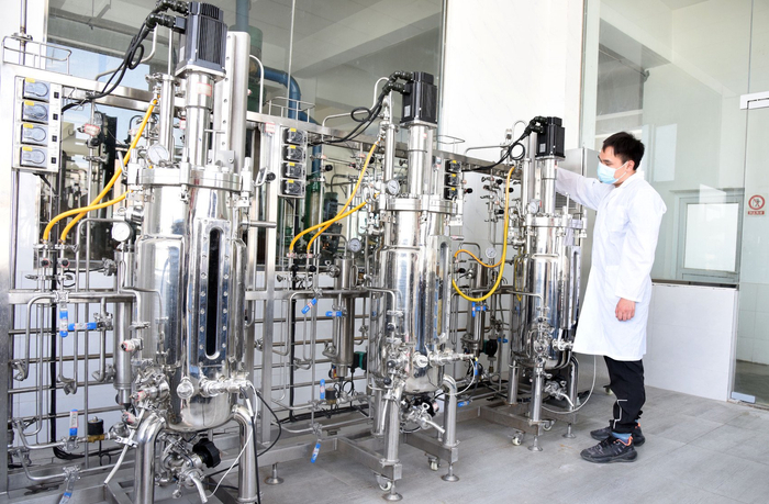 6月28日,在四川省微生物合成与生物制造中试研发平台的工程技术中心,研发人员正专心对发酵液状态进行检测分析。两百米开外的中试车间,装着发酵液的瓶瓶罐罐“摇身一变”,成为三层楼高、轰隆作响的生产罐。