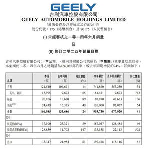 吉利汽车:集团6月总销量166085部,同比增长约24%