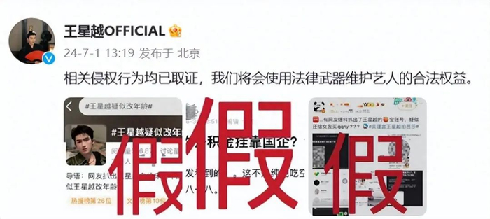 7月1日,针对“疑似改年纪、公积金挂靠国企”等传闻,男星王星越方面发文打假,表示“相关侵权行为均已取证,我们将会使用法律武器维护艺人的合法权益。”