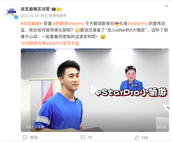 2022年,何猷君还带着eStar战队参加腾讯电竞综艺《战至巅峰》,和龚俊、杨幂、张瀚等明星艺人同台,为自己的战队扩大影响力。