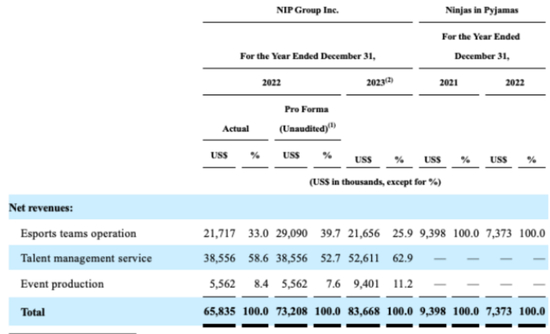 其中比赛奖金收入只占了一小部分,截至2023年底,星竞威武集团的两大战队eStar和NIP分别获得奖金7720万元、820万美元(约合6000万元)。2023年,星竞威武集团的电竞团队运营业务的营收为2165.6万美元(约合1.57亿元),占比约为25.9%,为第二大营收来源。