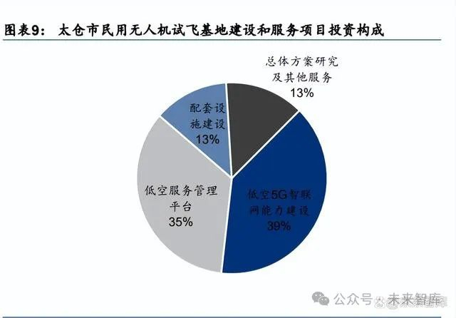 基础设施建设包含多个领域和环节,市场规模有望达 2300-4000 亿。从基础设施板块来看, 业务主要包括物理基础设施(如起降场等)、信息基础设施(如低空 5G 智联网能力建设)、 数字化系统(如低空服务管理平台)等。据苏州市公共资源交易平台,以太仓市民用无人机试飞基地建设和服务项目为例,该项目计划总投资 2650 万元,主要建设项目包括总体方 案研究及其他服务、配套设施建设、低空服务管理平台以及低空 5G 智联网能力建设,预算 投资金额分别为 270/350/950/1080 万元,其中基建平台建设费用占比超七成。 分业务看:①基建平台建设费用约 5 亿/示范区,短期 20 个示范区规模达100 亿,全国来 看规模有望超过 300 亿;②通用机场中直升机场/跑道型机场平均投资额为 3000 万/5 亿元, 据民航新型智库,2023 年末全国 451 个通用机场,2030 年预计达到 2058 个,新增约 1600 个,按照现有直升机场和跑道型机场数量比例估计,二者分别新增 1000/600 个,规模可到 3300 亿,短期建设规模预计占六成,约 2000 亿;③据各地低空发展政策,我们估计全国 长期起降点建设量 6800 个,短期 4000 个,大中小型数量比例 1%/33%/66%,据 IDEA 专 家测算,大型起降枢纽投资在 2000 万到 5000 万之间,中型起降场投资在 1000 万到 2000 万之间,小型起降点投资在 100 万以内,预计这部分投资规模短期近 250 亿,长期超 400 亿。综上,低空前期服务业务市场规模短期超 2300 亿,长期超 4000 亿,其中通用机场和 起降点建设占比较重,辅助类基建次之,规划设计业务相对规模较小,但可更快拿到市场 红利。
