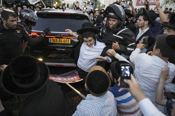当地时间2024年6月30日,耶路撒冷举行反对征兵抗议活动,极端正统派犹太男子在反对征兵的集会上与警察发生冲突。(视觉中国)