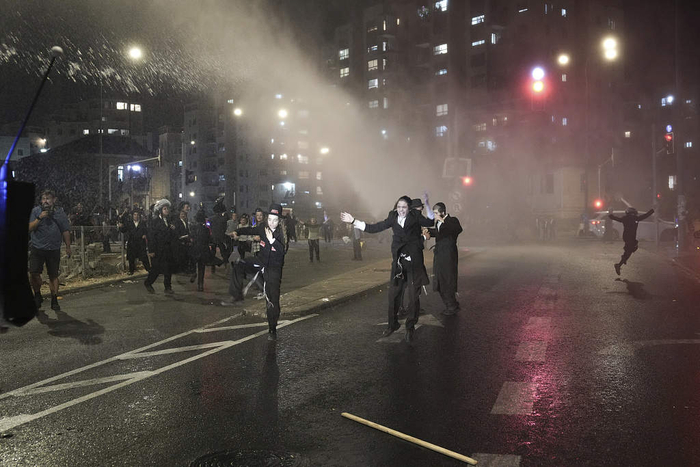 当地时间2024年6月30日,耶路撒冷,在反对征兵的抗议活动中,警察使用高压水枪驱散封锁街道的极端正统派犹太男子。(视觉中国)