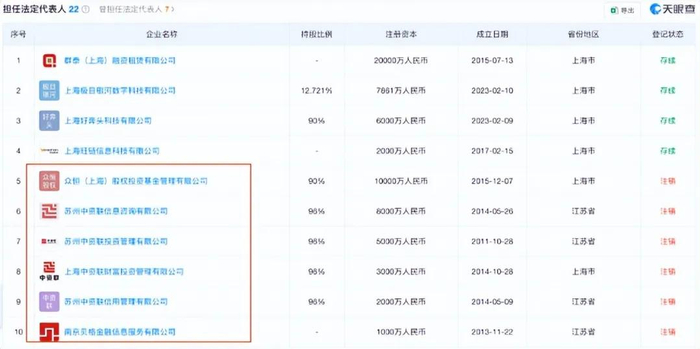据天眼查数据显示,他担任法定代表人的企业达一共22家,其中包括18家与金融投资相关的企业,但都显示已经注销。