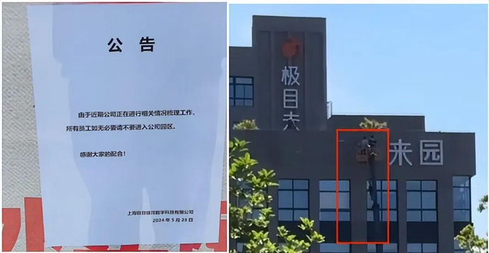 如今极目科技位于上海宝山区南蕰藻路819、869号总部园区大楼和门口的牌匾也正在拆除。园区门口也贴了一张公告,显示不得进入。
