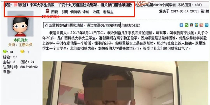 根据当时广西新闻网的报道显示,网友“木贝贝女”在网络社区求助,自己的儿子不久前通过“校园贷”借款1000元,欠款从几千元演变为几万元。