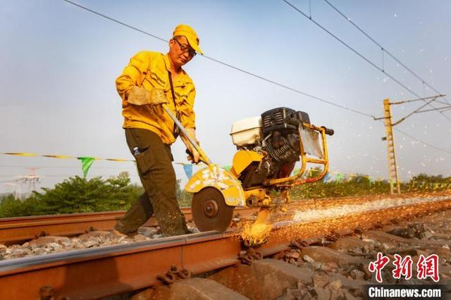 7月1日,2024年全国铁路暑期运输拉开帷幕。当日,中国铁路郑州局集团有限公司南阳工务段组织83名铁路职工对宁西铁路内乡至南阳西区段线路进行应力放散作业。施工人员切割钢轨、安装滚筒、无缝焊接,全力确保暑运期间线路设备安全稳定。图为铁路职工作业中。王宽宁磊 摄