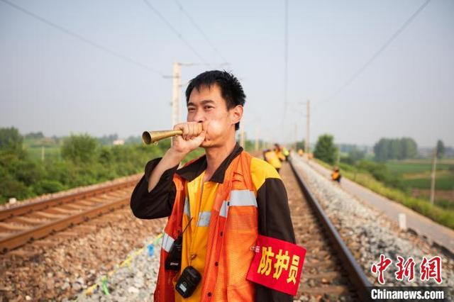 7月1日,2024年全国铁路暑期运输拉开帷幕。当日,中国铁路郑州局集团有限公司南阳工务段组织83名铁路职工对宁西铁路内乡至南阳西区段线路进行应力放散作业。施工人员切割钢轨、安装滚筒、无缝焊接,全力确保暑运期间线路设备安全稳定。图为防护员吹响号角提醒职工列车接近。王宽宁磊 摄