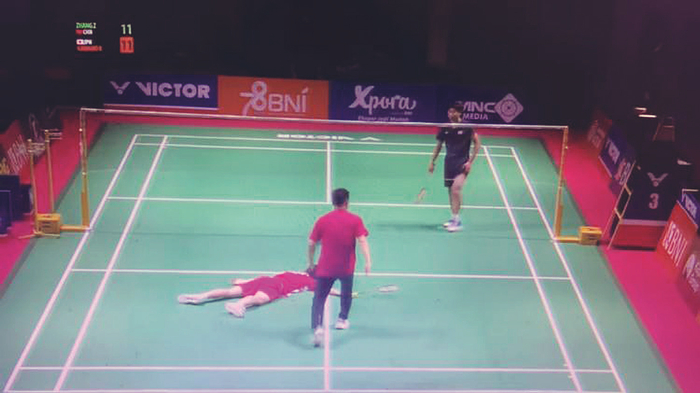 网上有一段2分45秒的现场视频,当时场上形势胶着,比分为11平。被对手追平后,张志杰走动擦汗,并未看出有异样,随后将羽毛球传给对手准备接发球,可就在这个过程中(视频时间为0分27秒),他突然向前倒地,随后身体开始抽搐。