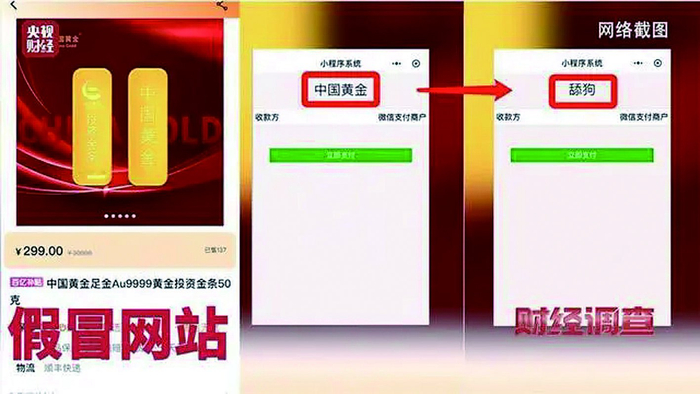 套路二便是卖完就跑路。记者在一家深夜卖黄金金条的直播间,看到支付页面最上方假冒的“中国黄金”四个大字,而到第二天假冒的“中国黄金”四个字竟然变成了“舔狗”,这个网络卖家就这样消失在了茫茫的互联网中。