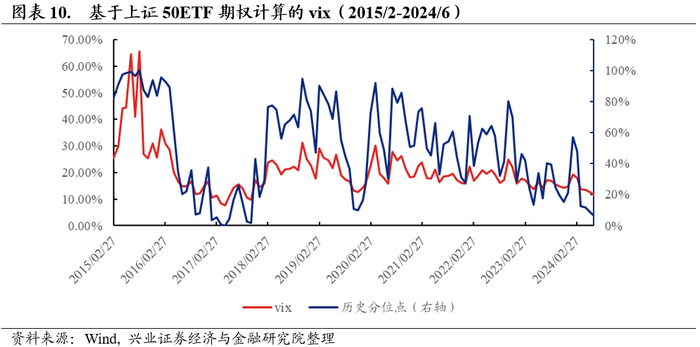 截至2024年6月底,基于上证50ETF期权计算的VIX为11.60%,处于历史6%分位点左右,显示期权投资者对市场预期无明显的系统性风险。