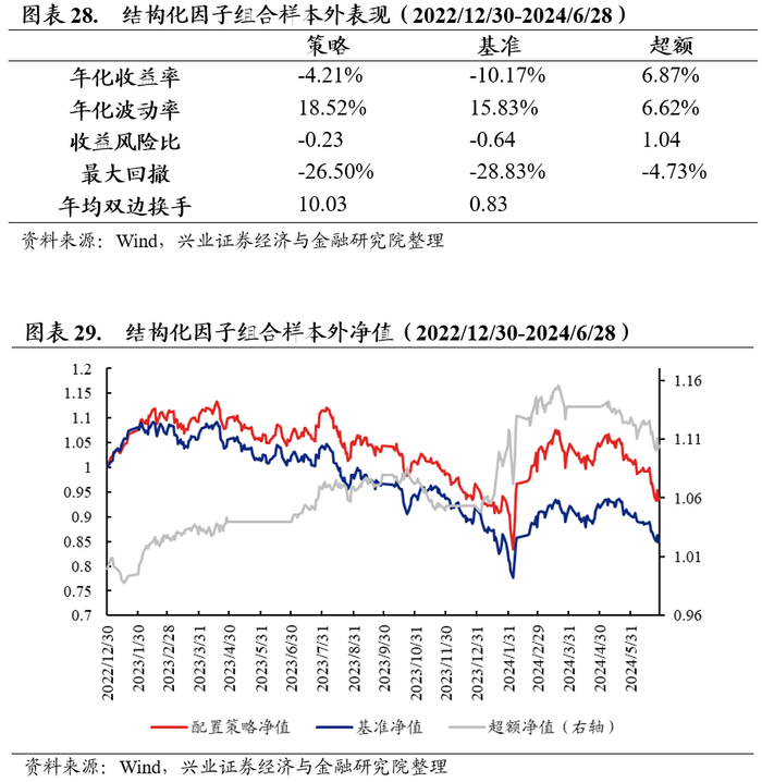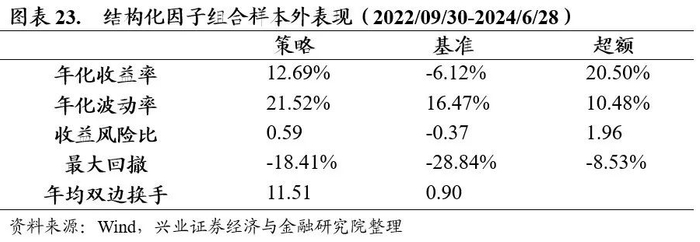 我们回测的时间范围是2013年底至2024年6月底,选取申万大小盘指数作为大盘和小盘风格的代表,使用大小盘月度调仓等权组合作为比较基准。从下方图表看,结构化多因子组合可以实现年化15.50%的收益率,0.63的收益风险比,最大回撤53.10%,均优于等权基准组合。结构化因子带来了11.89%的超额年化收益率,最大回撤为10.00%。值得注意的是,模型在2022年12月30日以来的样本外表现优异。策略实现-4.21%的年化收益,远高于基准-10.17%的年化收益率,月度胜率达到65%左右。