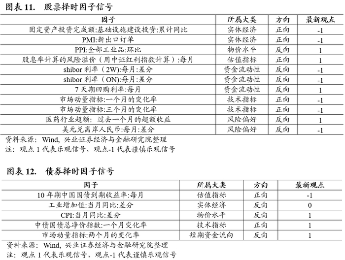 从兴证金工择时模型看,截至2024年6月30日,兴证股票择时模型给出谨慎乐观信号,债券择时模型给出乐观信号,信号因子具体情况见下表。