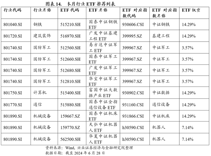 进一步,我们基于行业指数与行业ETF之间的逻辑关系、收益率相关性、股票持仓相似性与流动性等维度综合考虑,构建了行业与行业ETF之间的映射关系,并根据每个月的行业轮动观点提供ETF推荐列表,供各位投资者参考,下表展示了本月行业ETF推荐名单。