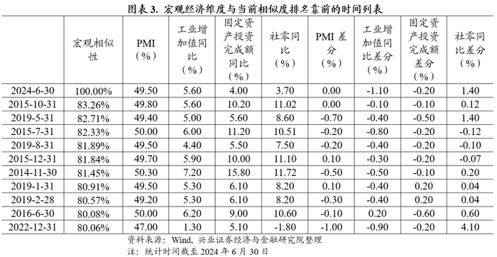 根据我们相似性模型的测算,当前宏观状态相似的结论比较模糊,所有历史时刻与当前打相似程度均未超过90%,与当前较相似的时段为2015年下半年,参考相似时段,同样存在一定经济下行压力。