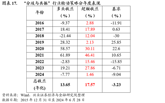 “共振与分歧”行业轮动策略高胜率特征突出,策略月度胜率达到了71.5%。同时可以发现,在过去的9年间(2016年至2024年6月),策略每年均能获得相对基准的超额收益,年胜率达到了100%。