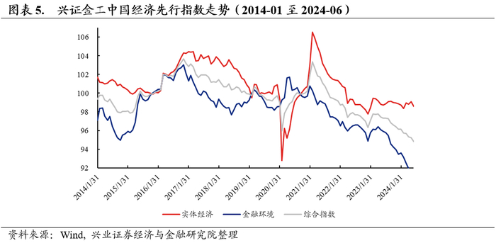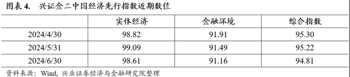 从兴证金工中国经济先行指数的走势看,2022年5月以来指数走势有所企稳。截至2024年6月28日,5月先行指数构建所需数据已全部披露完毕。其中5月综合先行指数为95.22,相比4月数值95.30有所下降;5月实体先行指数为99.09,相比4月略有上行;5月金融环境指数为91.49,相比4月略有下降。