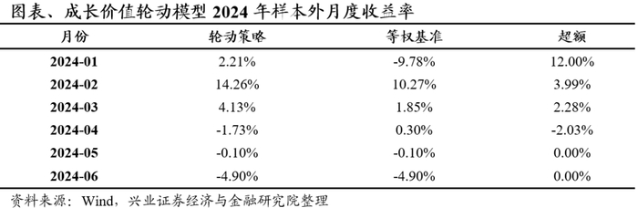 从最新风格观点看,截至2024年6月底,由于流动性维度偏向小盘,市场拐点期看好小盘反弹,大小盘轮动模型总体给出小盘风格占优的信号。由于美债利率下行,股市反弹期指标看好成长反弹,成长价值轮动模型给出成长风格占优的信号。成长价值模型在2022年9月底以来的样本外年化收益12.69%,远高于基准-6.12%的年化收益,月度胜率大约70%。大小盘轮动模型在2022年12月30日以来的样本外实现-4.21%的年化收益,高于基准-10.17%的年化收益,月度胜率达到65%左右。