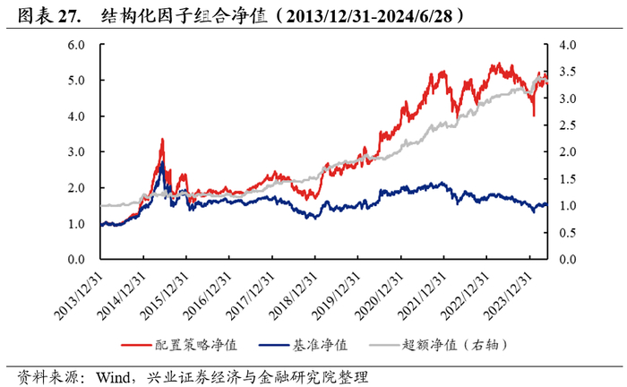 我们回测的时间范围是2013年底至2024年6月底,选取申万高低市盈率指数作为成长和价值风格的代表,使用成长和价值的月度调仓等权组合作为比较基准。从下方图表看,结构化多因子组合可以实现年化23.22%的收益率,0.94的收益风险比,最大回撤43.63%,均优于等权基准组合。结构化因子带来了19.60%的超额年化收益率,最大回撤为13.08%。